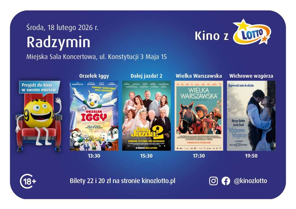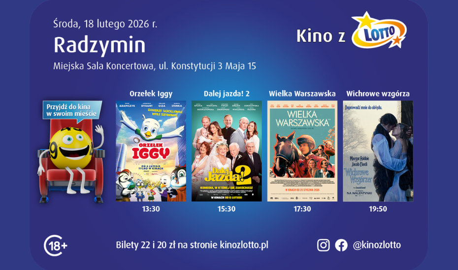 Kino objazdowe z LOTTO w Radzyminie to wyjątkowe wydarzenie, które łączy premierowe kino, dobrą zabawę i społeczną odpowiedzialność. Seanse filmowe, zniżki dla użytkowników aplikacji LOTTO, możliwość głosowania na lokalne inicjatywy oraz loteria z nagrodami sprawiają, że to jedna z najciekawszych propozycji kulturalnych tej zimy. Jeśli chcesz przeżyć filmowe emocje, a jednocześnie wesprzeć lokalny rozwój koniecznie zaplanuj wizytę już 18 lutego w Miejskiej Sali Koncertowej na ul. Konstytucji 3 Maja 15.